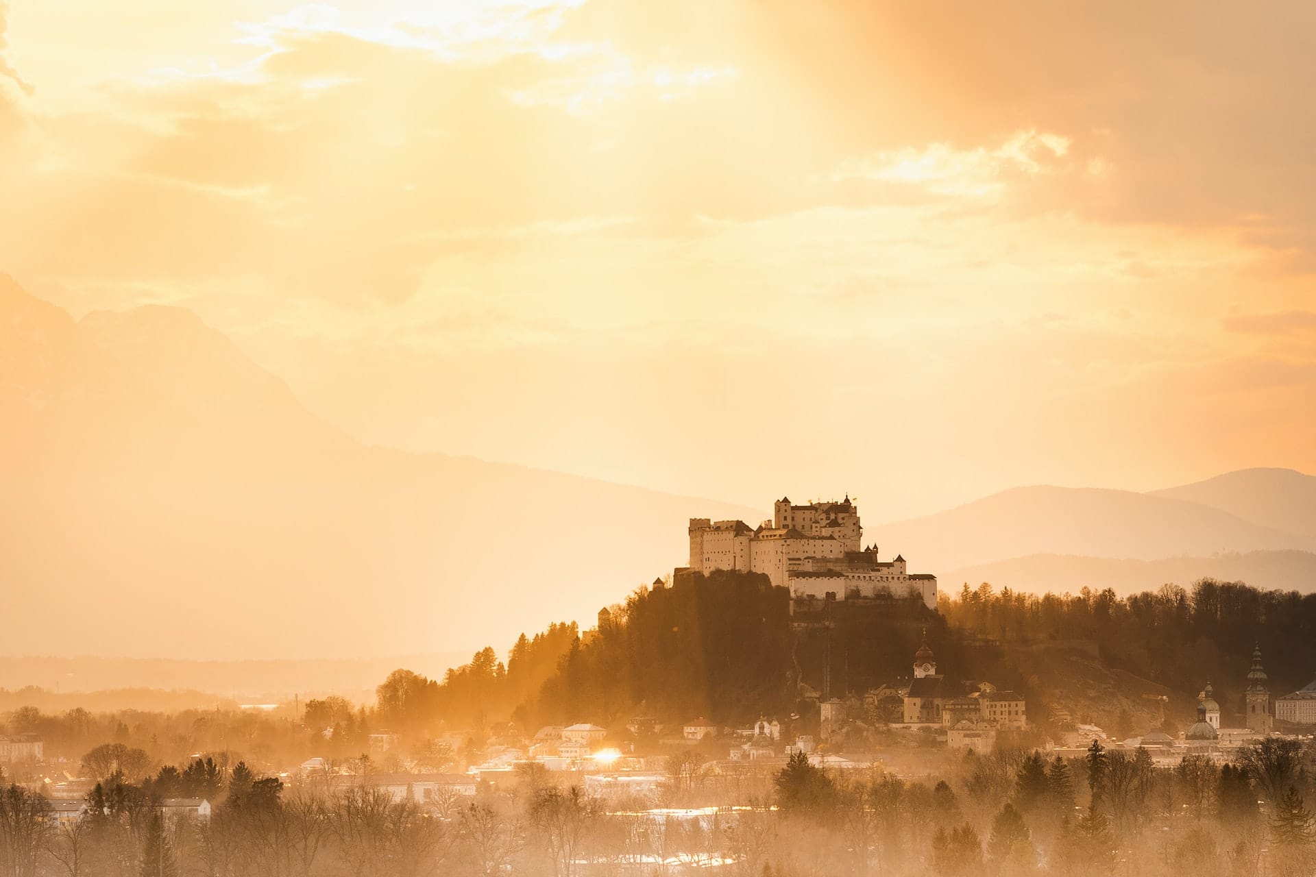 Kickstart your day with a full breakfast. After you will board a scenic train ride, traversing picturesque landscapes as you make your way to the enchanting city of Salzburg. Depending on the timing, your tour leader will advise on when you can enjoy a leisurely lunch. Upon arrival, check into your new accommodations, settling into the charming ambiance of Salzburg. Then, embark on an orientation walk through the city, soaking in its timeless charm and iconic landmarks. After, ascend to the majestic Hohensalzburg Fortress, perched high above the city, and delve into its rich history and panoramic views of Salzburg below. As twilight descends, take your time strolling through the historic streets as you'll have the remainder of the day at your leisure.